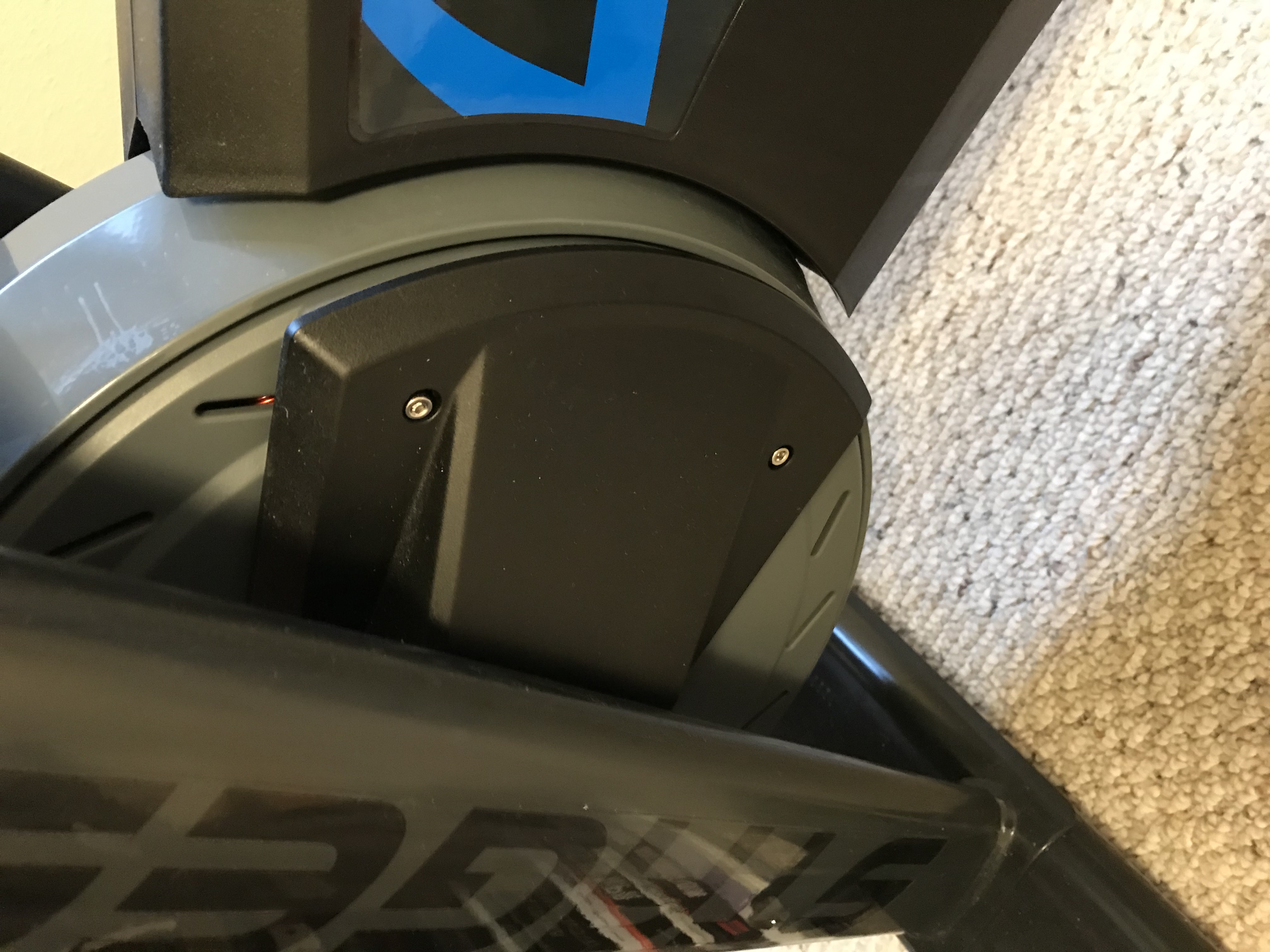 WARNING: The bike MUST be unplugged before moving to this step!- Use a 3 mm hex key to remove the 2 screws that hold the rear flywheel cap in place. Slide the cap backward and set it aside.
