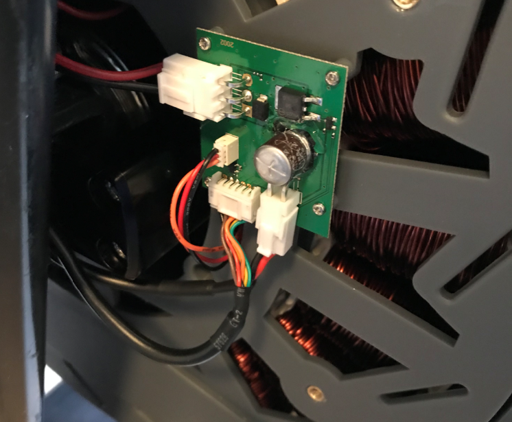 - Use the small Phillips screwdriver to remove the 4 screws that hold the PCB to the flywheel; set aside for reassembly.