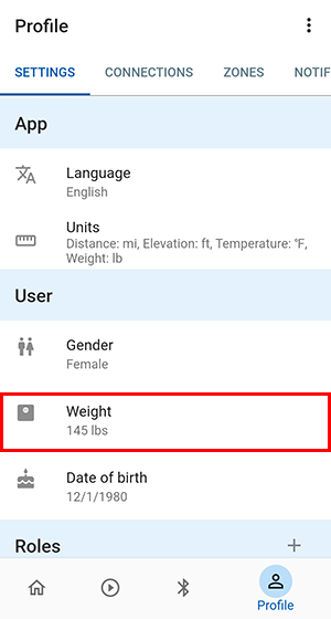 Select the Profile tab at the bottom of the app to access the user settings menu. The weight entered here is used to calculate resistance, so it's important to set it accurately. It doesn’t have to be exact but try to keep it close to your real weight for the best results.